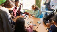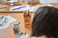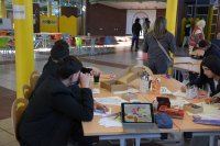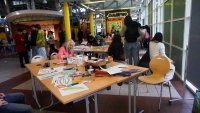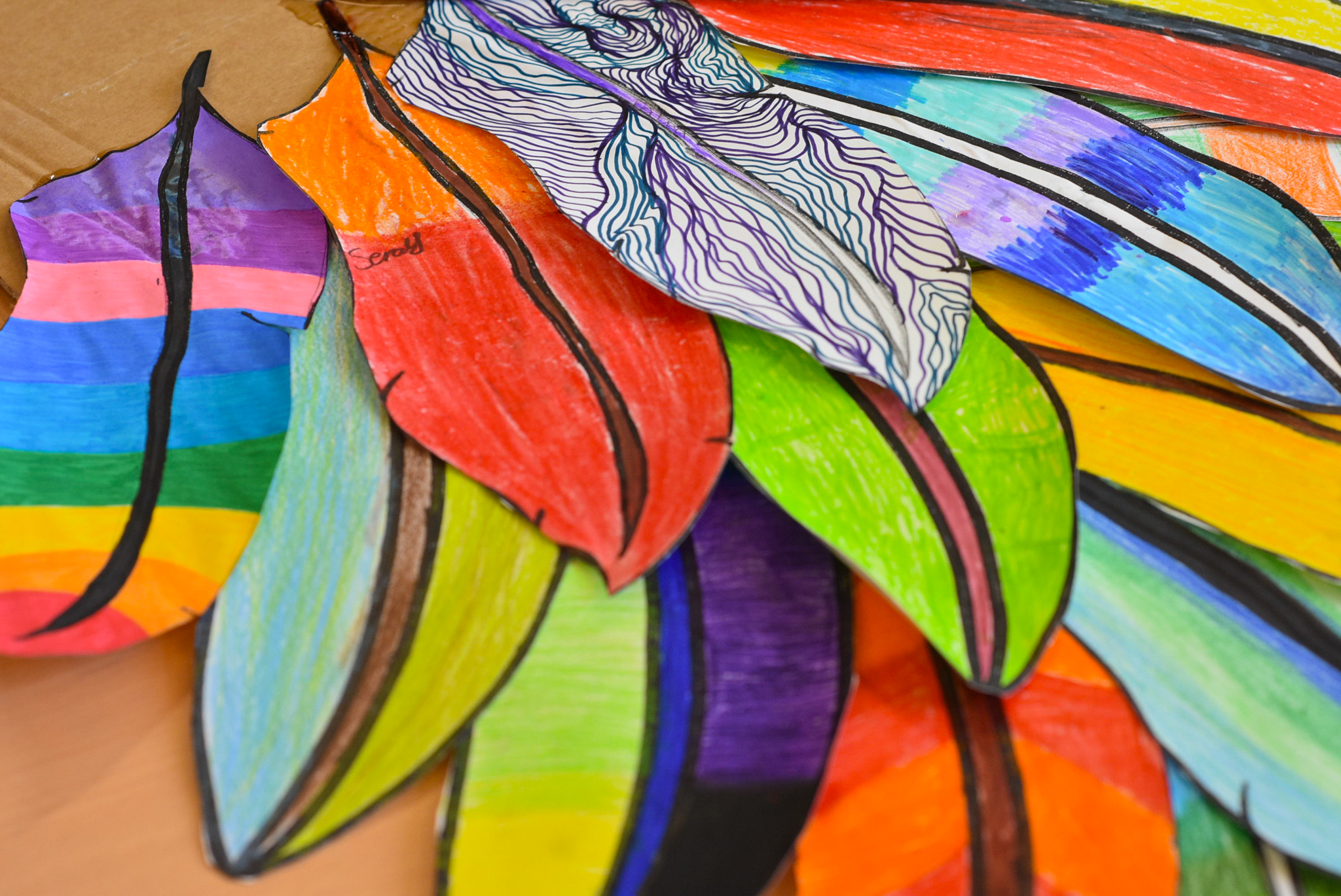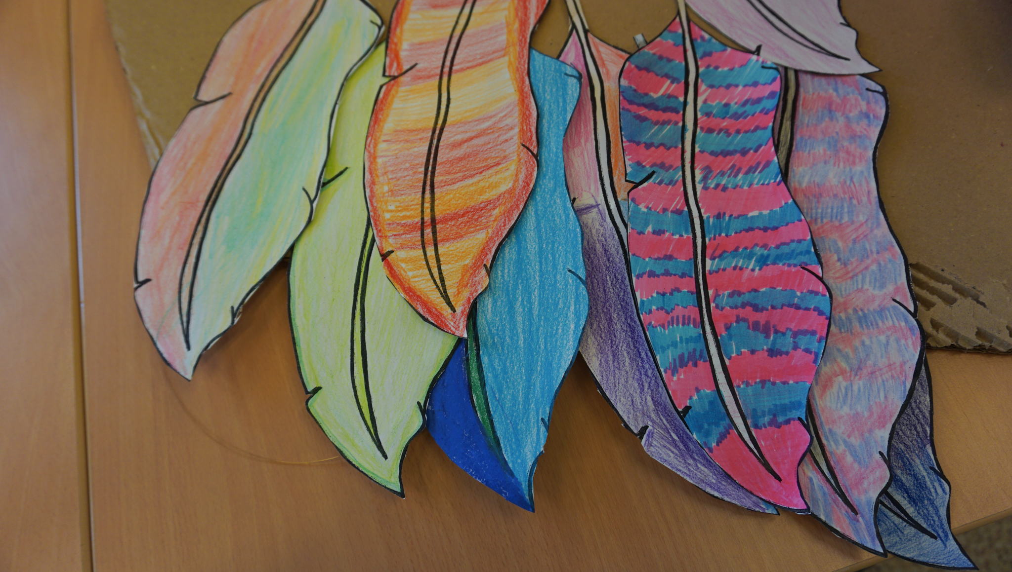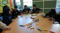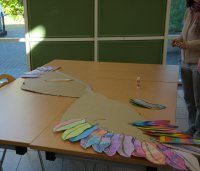 Neben den sportlichen Angeboten gab es zahlreiche Möglichkeiten, die kreative Seite zu entdecken: Individuelle Federn entstande, um zwei gemeinsame Flügel zu gestalten, die später im Schulgebäude aufgeängt werden sollen. Buttons mit eigenen Lieblingsmotive- oder Sprüchen durften auch nicht fehlen.