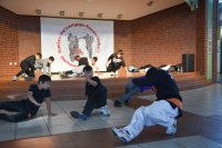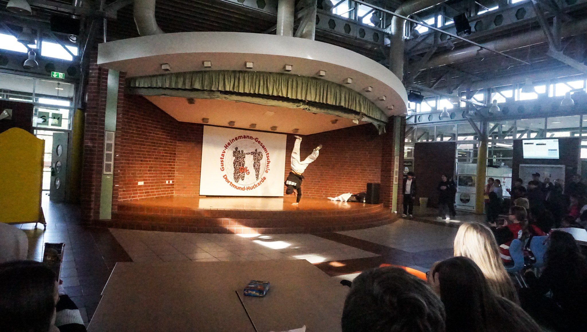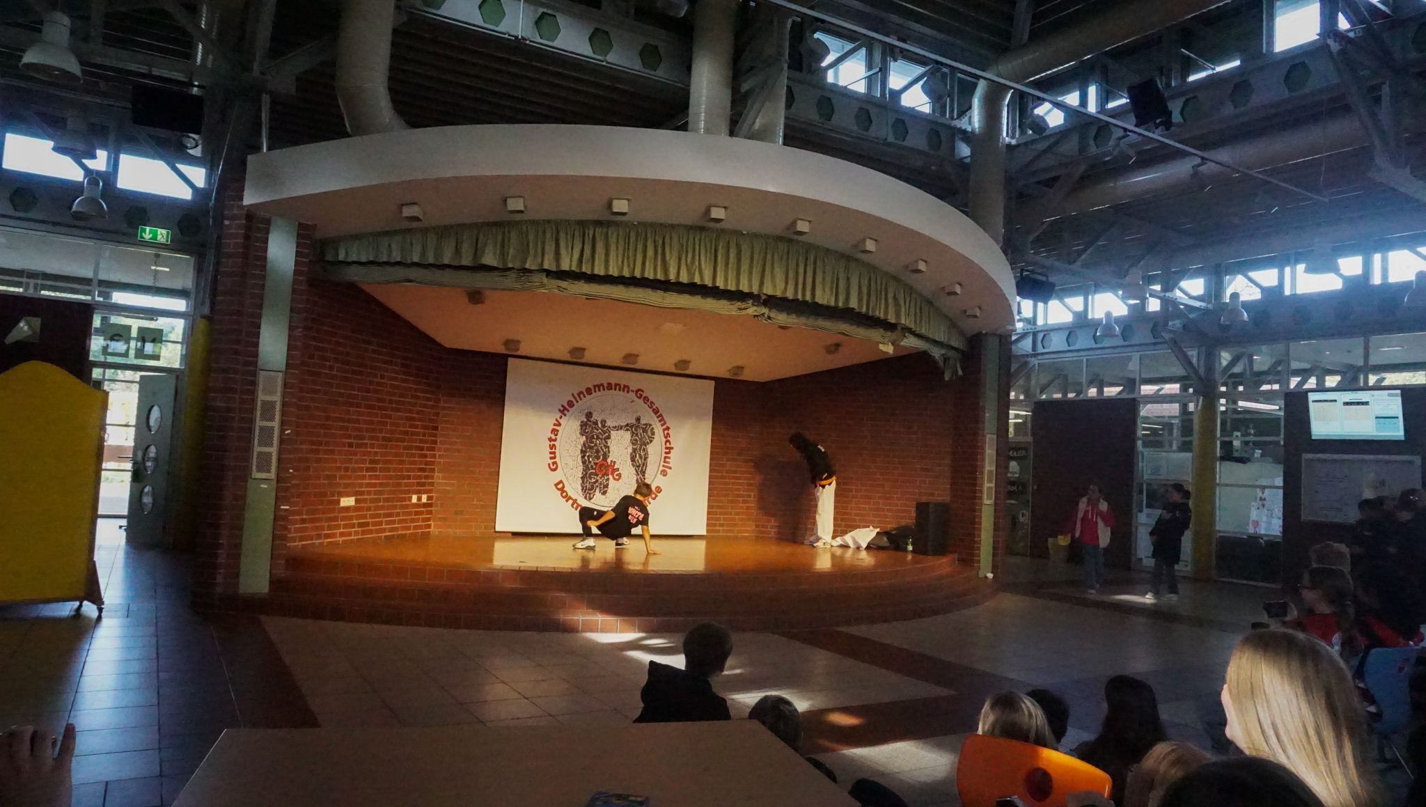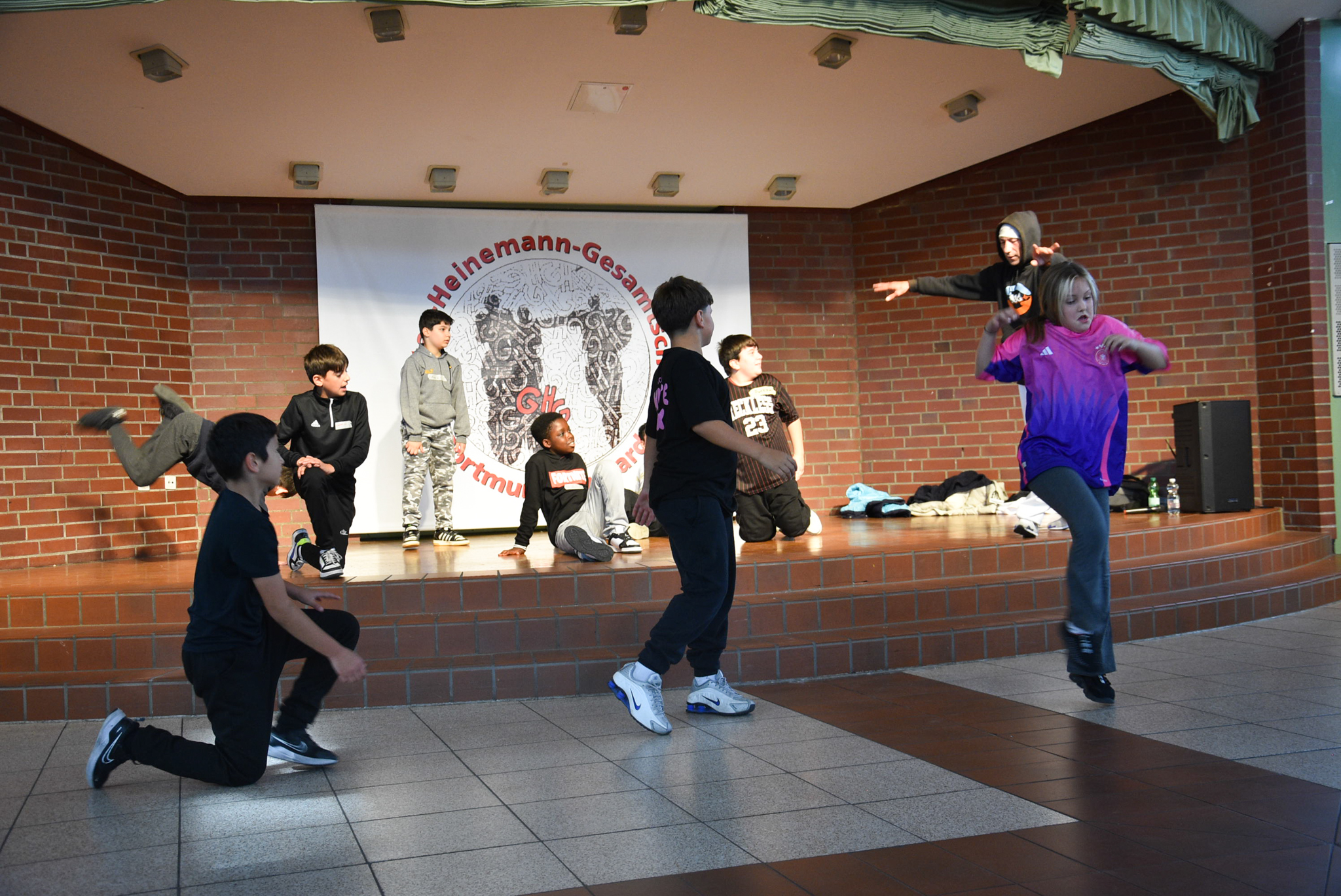 Besonders beeindruckend war der Auftritt eines professionellen Breakdancers, der nicht nur sein Können zeigte, sondern anschließend mit den Kindern einen kleinen Workshop durchführte. Die Schülerinnen und Schüler konnten selbst erste Moves ausprobieren – ein unvergessliches Erlebnis!