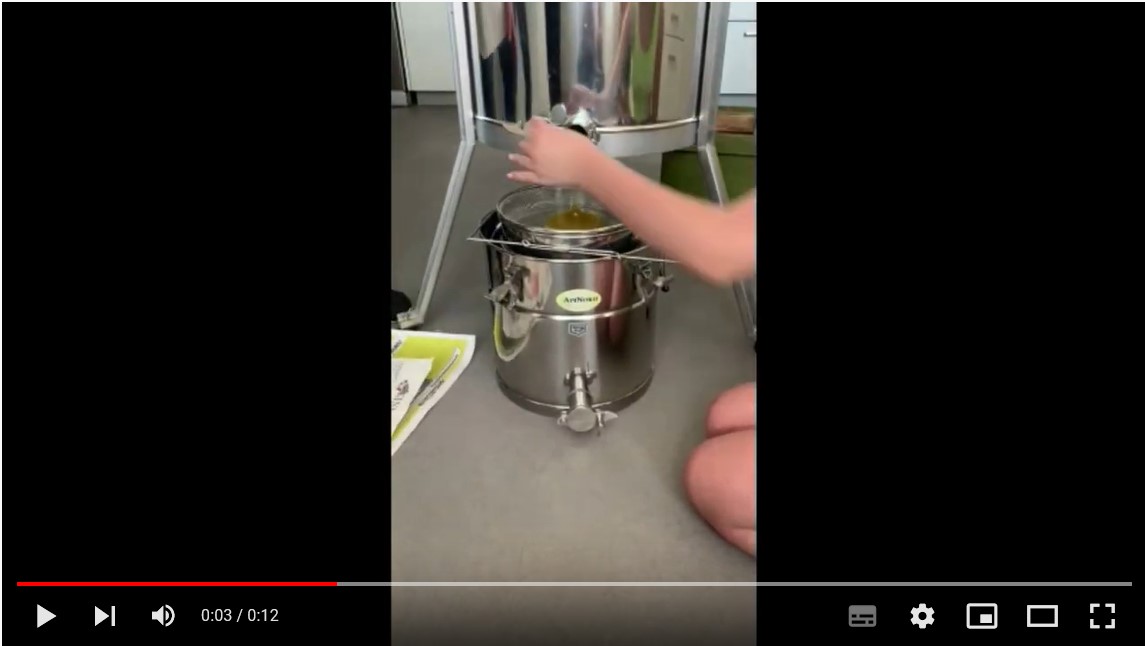 Die Honigwaben, in denen die Bienen den gesammelten Nektar und die Pollen speichern, werden in eine Honigschleuder gegeben. Diese dreht sich schnell und schleudert den Honig aus den Waben an den Rand des Behälters.